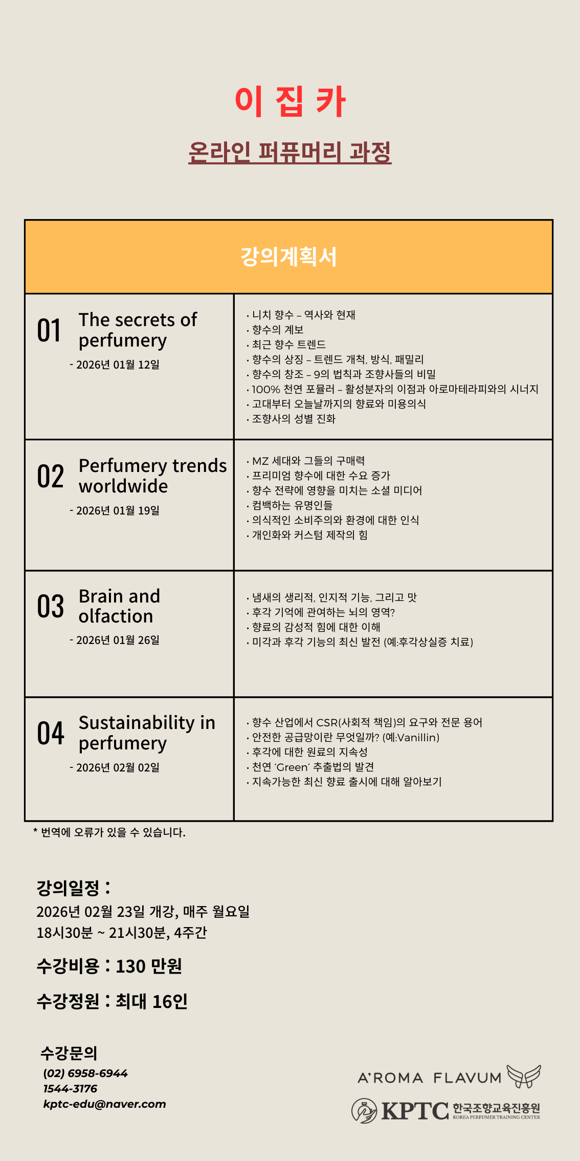 ► 본 과정은 프랑스 ISIPCA의 4명의 교수들이 각 주제 별로 직접 강의하는 원격 과정으로 통역이 함께 참여합니다.