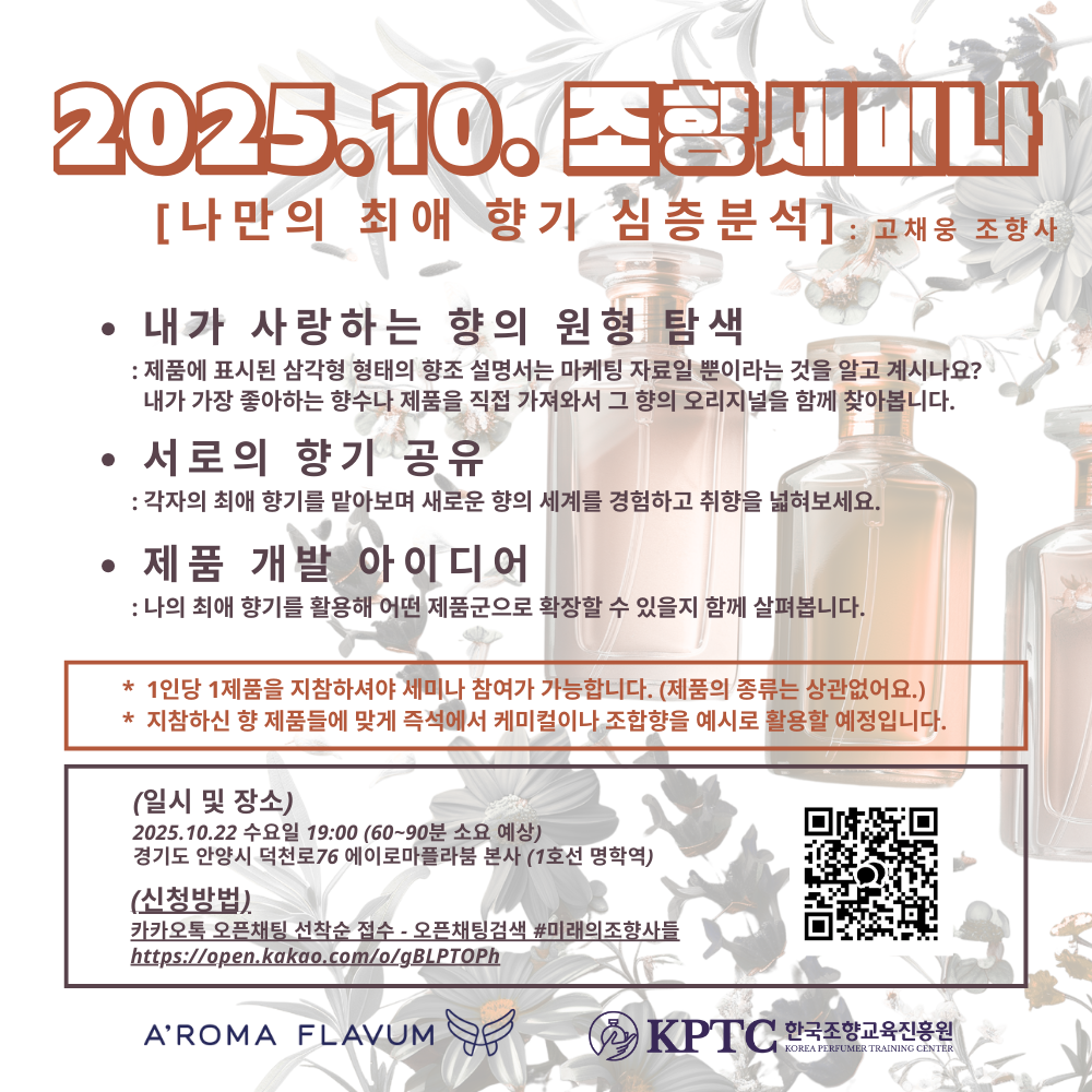 무료세미나에는 강의 수강여부와 상관없이 조향과 향료에 관심이 있으신 누구나 참여하실 수 있습니다.