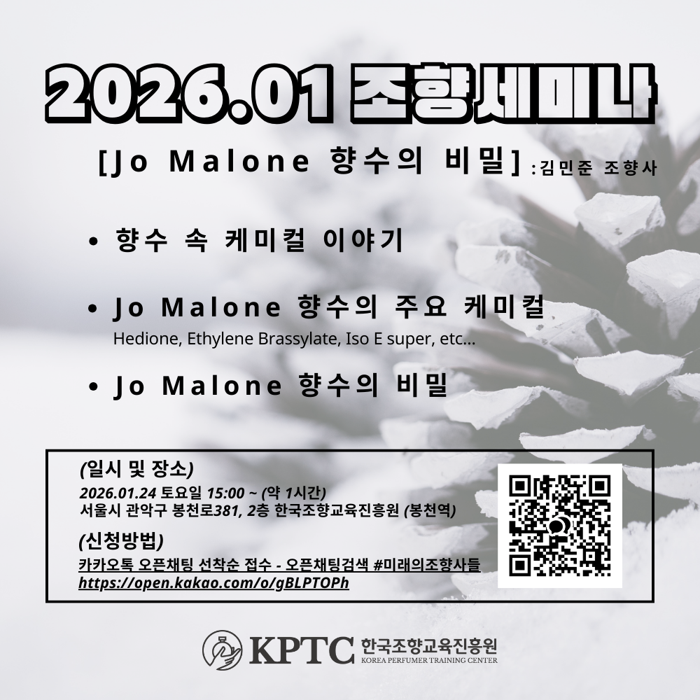 01월 세미나 주제는 "Jo Malone 향수의 비밀"이며 조말론 향수의 주요 케미컬들을 함께 시향하고 뼈대를 구성하는 방식에 대해 알아볼 예정입니다.
